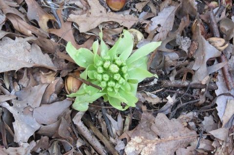 Now, this is a weed. At least I thought it was or is. When I took the photo, I knew it was a weed and pondered that every single year when it first peeps up through the mulch, I think it might be one of the hyacinths that I planted in the fall so I leave it for a bit. And then, I think that it is a weed and I decide that I like its cool green-ness in early spring and its symmetry so I decided I will leave it for just a little longer. But soon I figure that I will have to go out and remove it before it grows and blooms and spits out seeds everywhere. And then at some point, it grows a little more and I am reminded, usually by the gardening buddy who gave me the plant, that it is a petasites japonicus, or more commonly known as Fuki or Sweet Coltsfoot. When it is mature, it will look totally different – more like a variegated hosta with rounder leaves. The fact that it is still here tells me that I have gone through this thought process before and have been lax in removing plants that I first thought might be weeds. It is a good thing that I haven’t always gotten to it quickly enough to prevent it from spreading further. Since it was a gift from a friend, I would be saddened to think that I would root it out before I realized that it was not just another weed.