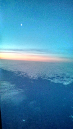 What always catches my attention at first is the sheer beauty of the earth from this viewpoint. Add a little sunrise as you are headed east while a small sliver of moon remains and it is even more beautiful. Or, is it the other way around? One of these photos is the late evening sunset as we leave Atlanta and the other is the sunrise somewhere over England as we travel towards Amsterdam. Can you tell which is which? That is the trouble with photos taken from airplane windows – you just cannot tell where you are exactly. Slipping into “space” takes away the familiar and the known and leaves you somehow free to leave your gravity-bound burdens behind like stones scattered across the field.