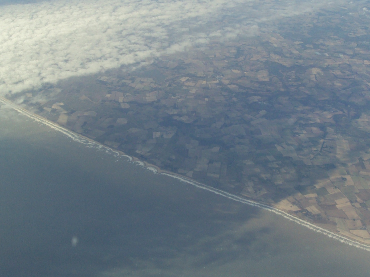 And there is the coast so we’re moving over the North Sea or maybe the English Channel – hard to say from this distance. But I see interesting crescent shaped harbors (?) or maybe beaches below. There do not seem to be marinas or other manmade structures in view – just the curious semi-circular beaches. Could these be “beach circles” or beach semi-circles at least? I think maybe the aliens are really pulling out all the stops trying to communicate.