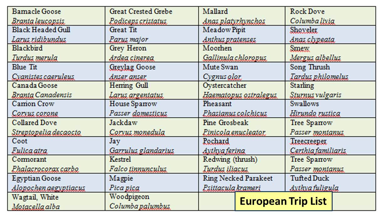 All in all, without really looking or doing any serious birding, we saw 42 different species that we could affirmatively identify. We saw several hawks overhead and from a distance, plenty of gulls that were not close enough to see discriminating marks, and other birds we just couldn’t identify so we do not include them in the count. Since this is the first time we have looked for birds in Europe at all, most were life-birds and added to our combined life list quite nicely. Notably missing from the list were woodpeckers. We just did not see any woodpeckers although we did hear a bird that sounded very much like a Red-Bellied Woodpecker (Melanerpes carolinus) from back home.