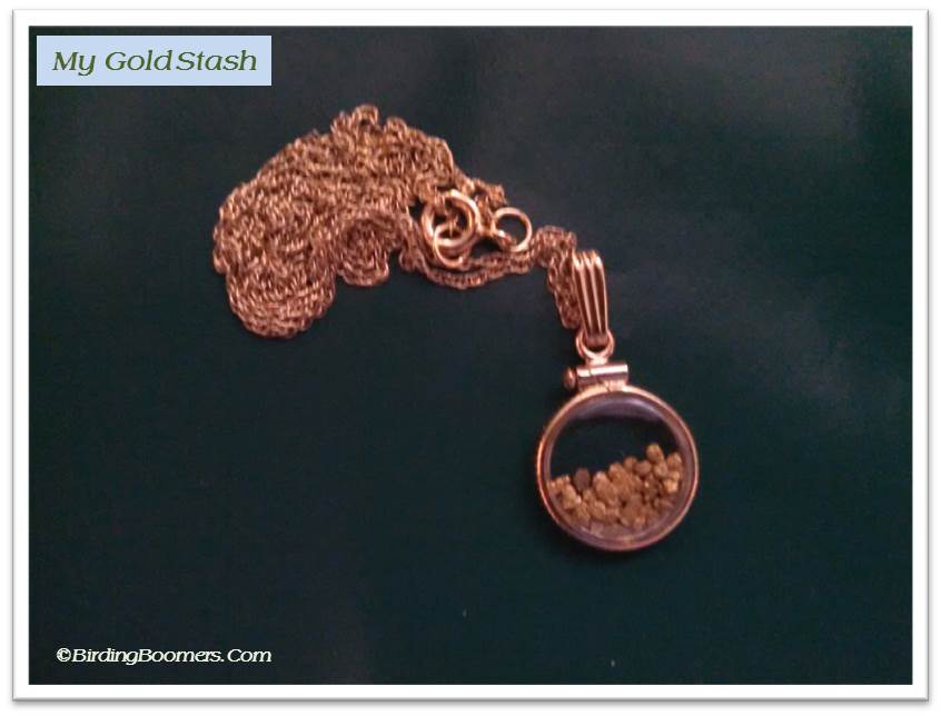 We took our gold and headed on up to the souvenir shop (of course) to get it assayed and discovered that all together we had scored a whole $33 worth of gold for our effort. Being the good people that they were, they offered to buy it…or better yet, to sell me a lovely little locket to hold my gold with a nice gold chain….for a mere $34 dollars and some change. (Actually, they would have sold me a more expensive piece of jewelry for my gold…but I opted for the less expensive charm & chain.) This worked out to be one of those credit card commercials – you know, cost of the trip to Alaska, cost of the ticket for the tour, cost of the pan & sack of sand, etc.,…….finding gold flakes in your very own pan – priceless!
